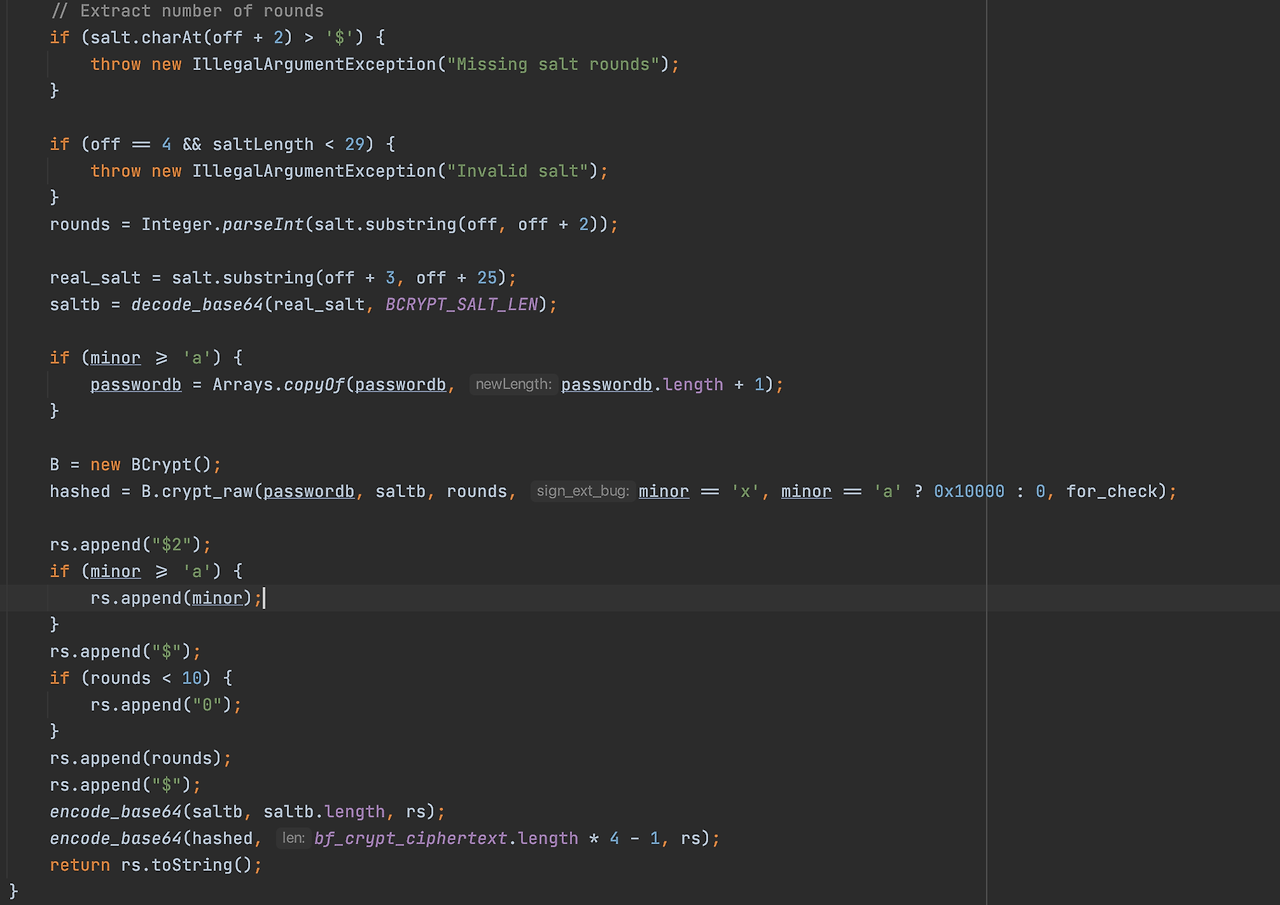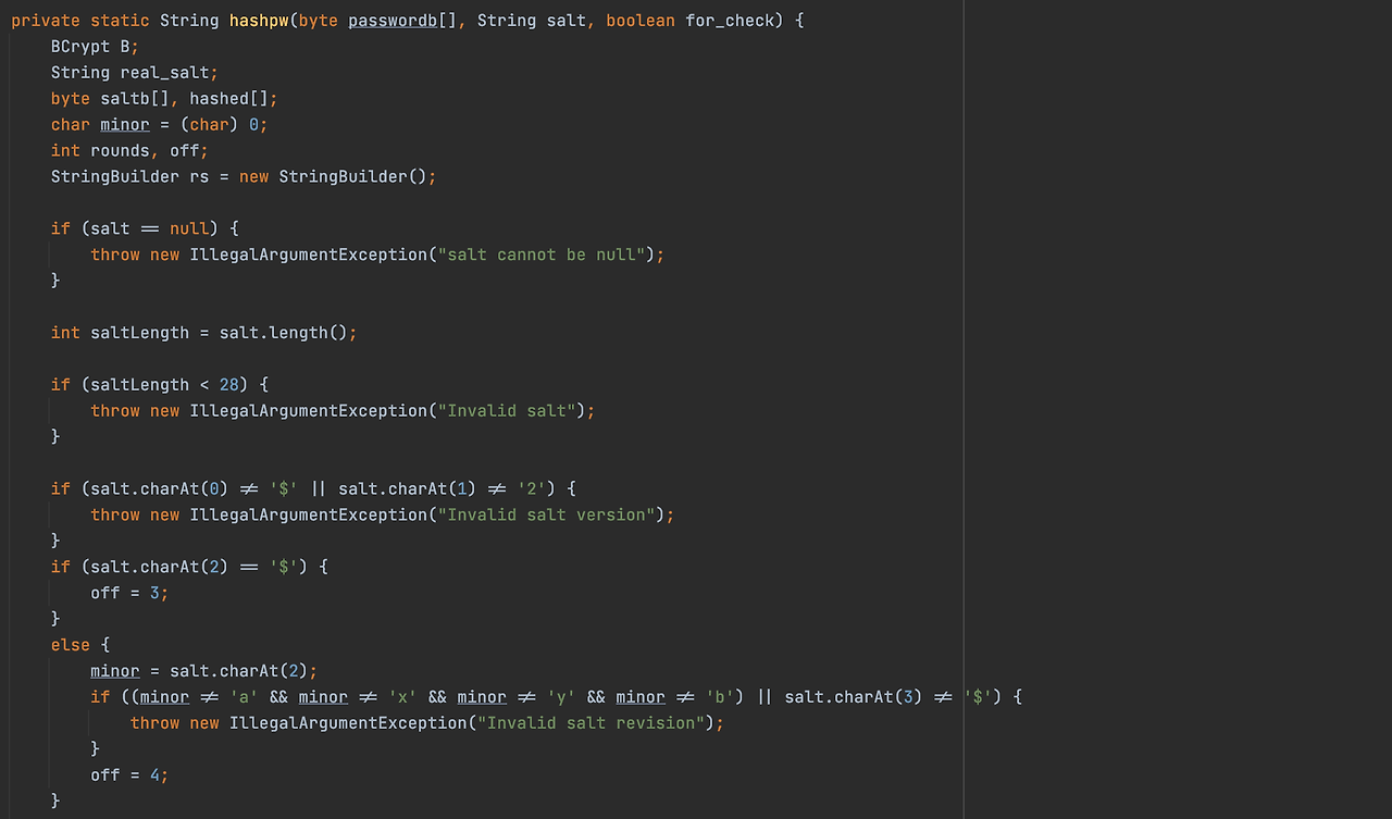 주어진 비밀번호와 salt를 사용하여 Bcrypt 해시를 생성하는 메서드이다.