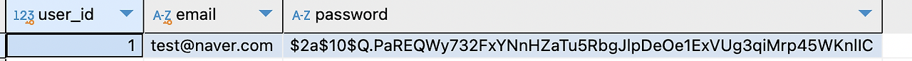 BCryptPasswordEncoder의 encode 메서드를 사용하면, 위와 같이 암호화된 값이 들어가는 것을 볼 수 있다.