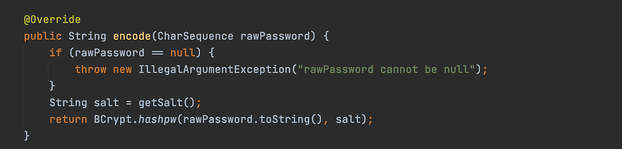 Bcrypt 알고리즘을 사용하여 비밀번호를 해시하는 메서드로 salt를 생성한 후, Bcrypt 알고리즘을 사용해 비밀번호와 salt를 결합해 해시된 비밀번호를 생성한다.