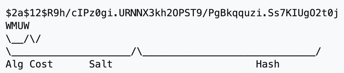 - 12: cost factor (2^12의 해시 연산 수행, 4096 rounds), 숫자가 높을수록 연산이 느려지고 보안이 높아진다.