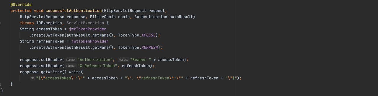 attemptAuthentication 메서드는 로그인 요청 시 호출되며, 사용자 인증이 성공하면 액세스 토큰과 리프레시 토큰을 생성한다.