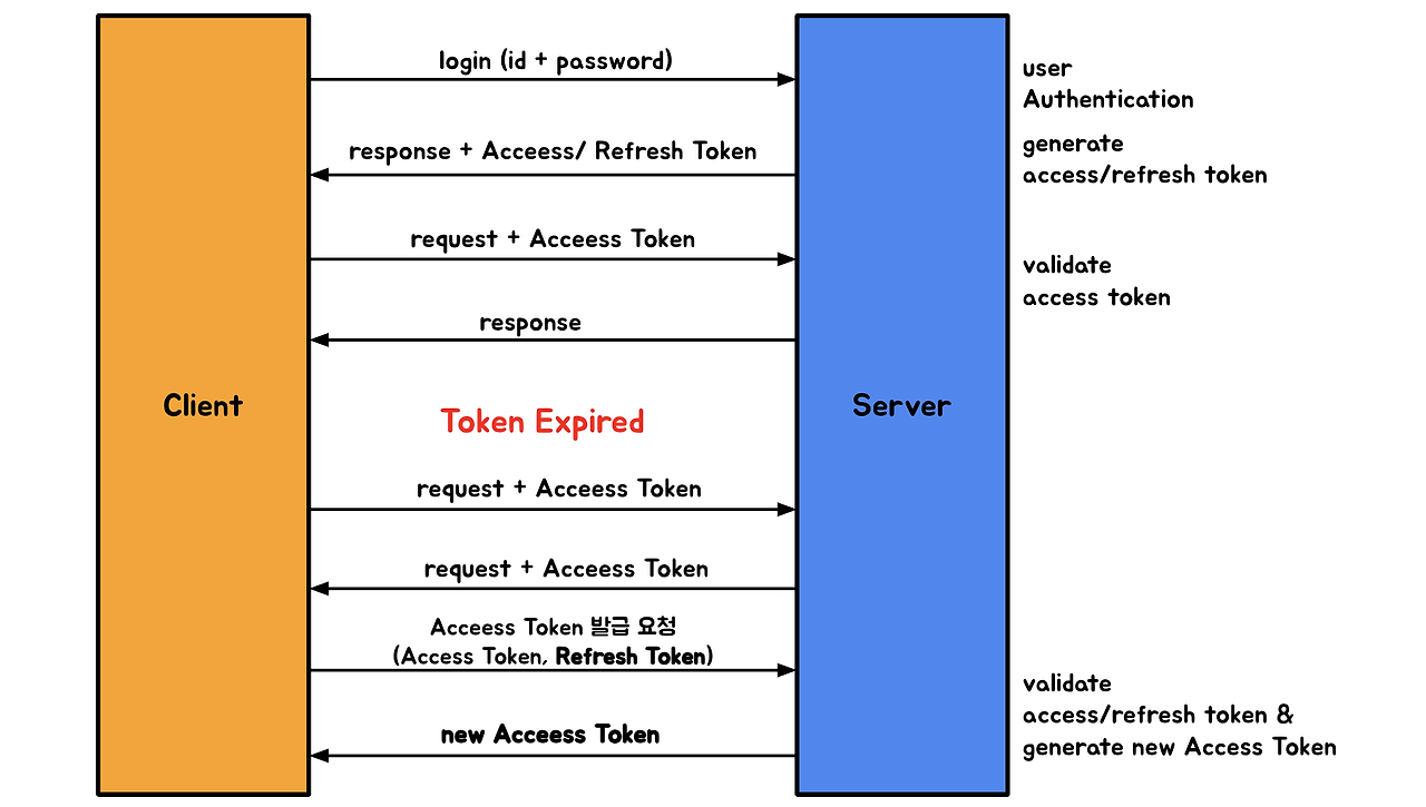 Access Token은 유효기간을 짧게 설정해서 토큰이 자주 갱신되도록 하고, Refresh Token은 유효 기간을 상대적으로 길게 설정하여 Access Token이 만료될 때마다 유효한 Refresh Token을 이용해 새로운 Access Token을 발급 하도록 한다.