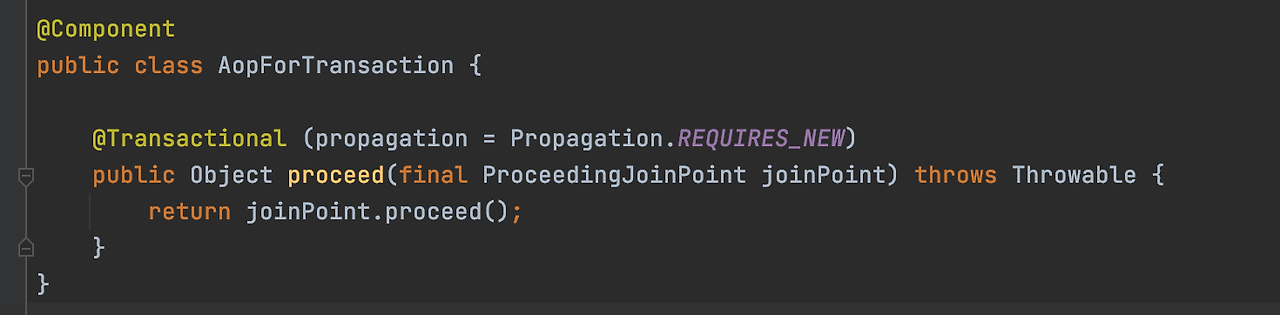 aopForTransaction.proceed(joinPoint) : DistributedLock 어노테이션이 선언된 메서드를 별도의 트랜잭션으로 실행한다.