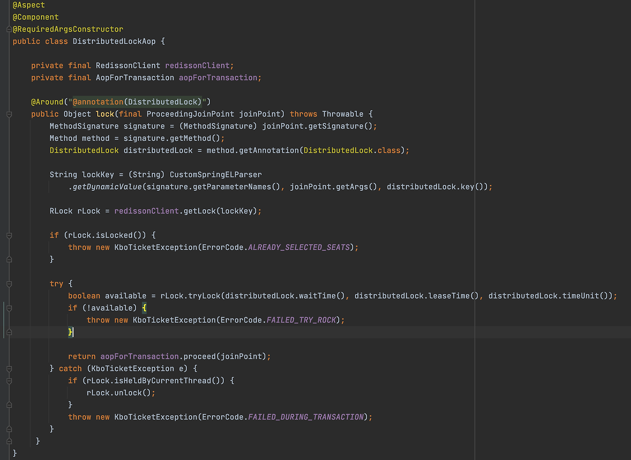 어노테이션 기반의 AOP를 이용해 분산락을 관리하는 로직을 별도의 컴포넌트를 구성했다.