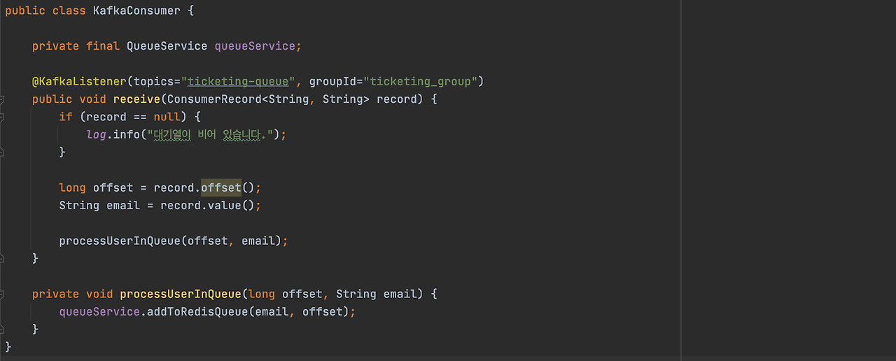 - receive(): 메시지를 받으면, ConsumerRecord를 통해 메시지 내용(email)과 오프셋(offset)을 추출하는데, 만약 메시지가 없다면 “대기열이 비어 있습니다.”라는 로그를 출력한다.