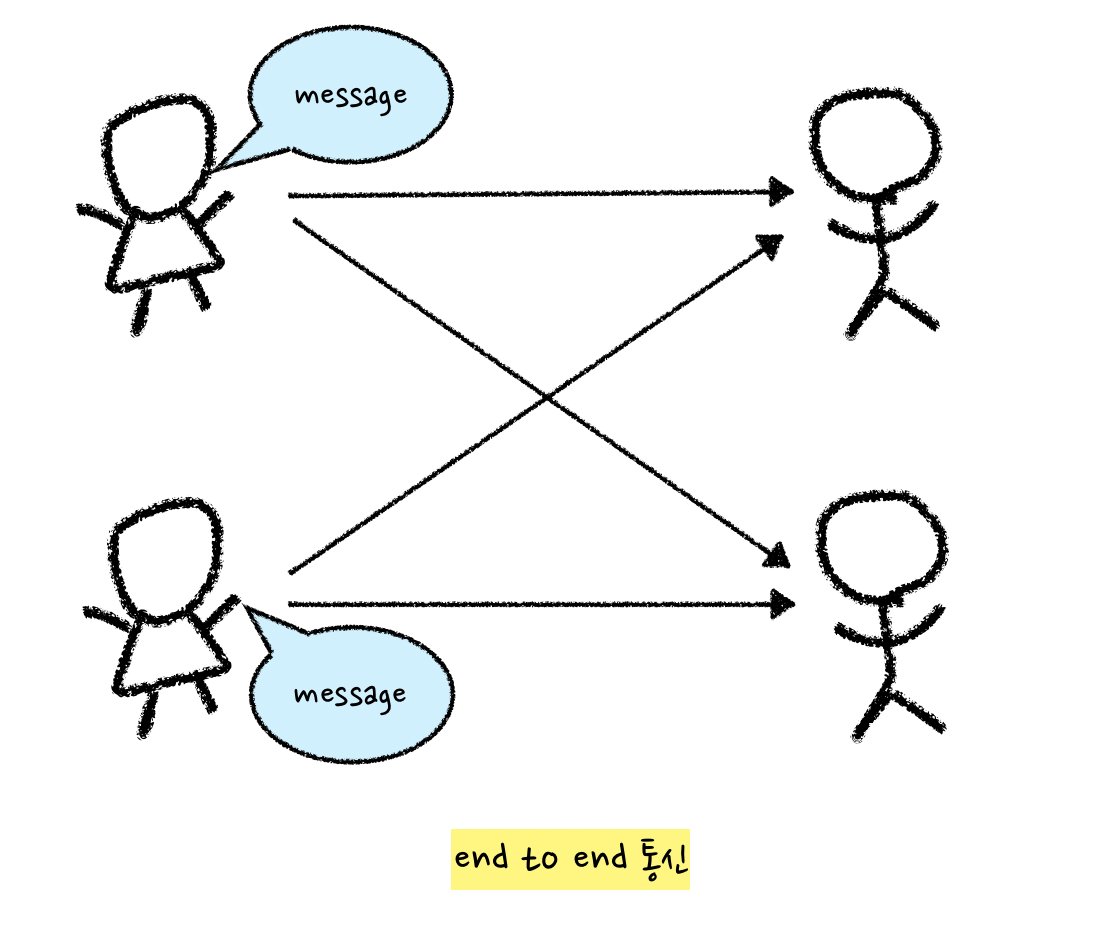 보틍은 위와 같이 각 객체가 직접 연결하여 통신한다. 이 방식은 전송 속도가 빠르고 전송 결과를 빠르게 알 수 있지만, 중간 단계가 없기 때문에 문제가 발생하면 시스템 전체에 영향을 끼칠 수 있다. 한 부분에서 장애가 발생 시 전체 시스템에 영향을 미칠 수 있고, 참여하는 개체가 많아질 수록 시스템이 복잡해진다.