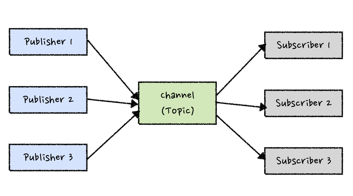 발행자와 구독자가 서로 직접 연결되지 않고, 중간 채널을 통해 메시지를 주고 받는다. 이를 통해 구독자는 발행자가 누구인지 알 필요 없이 원하는 메시지만 수신할 수 있닫.