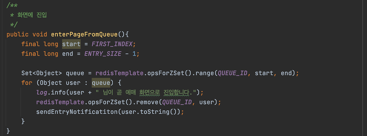- 대기열에 있는 유저들을 예매 화면으로 진입시키는 메서드이다.