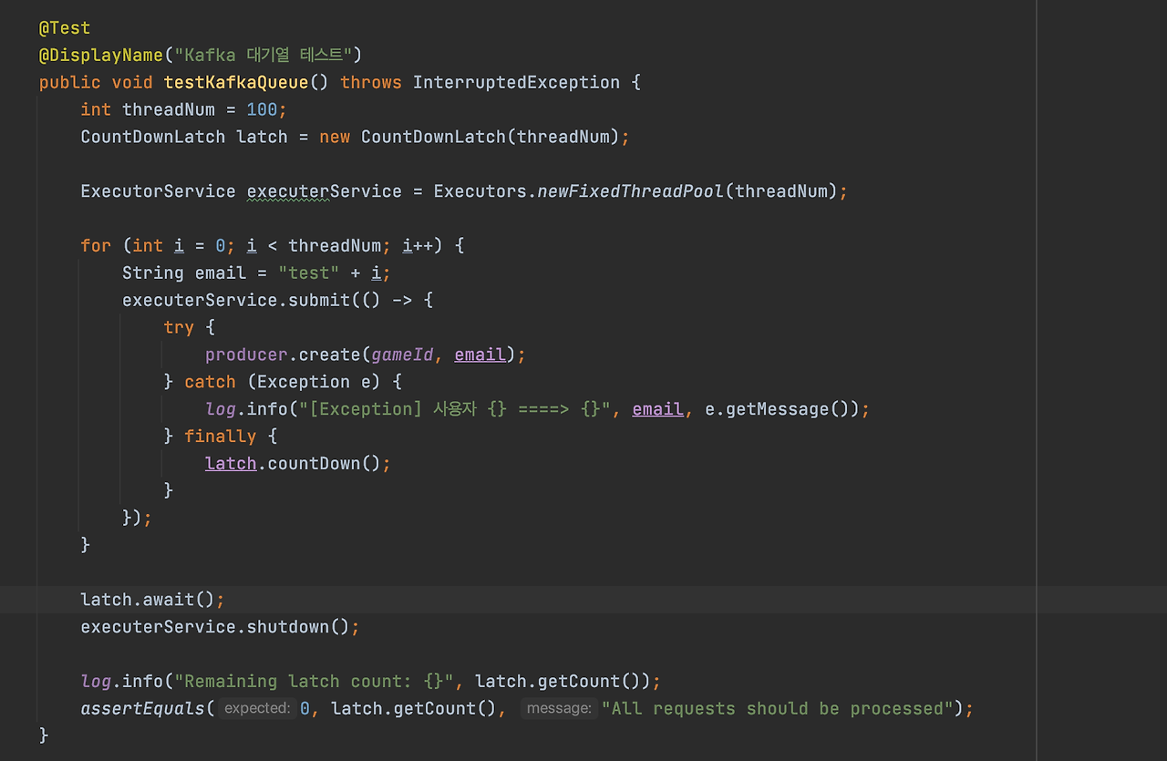 각 스레드는 producer.create(gameId, email)을 호출하며, 발생 가능한 예외를 로깅한다. 모든 요청이 정상적으로 처리되었는지는 CountDownLatch를 통해 확인하고, 작업 완료 후 모든 스레드가 정상 종료되었는지도 검증한다.