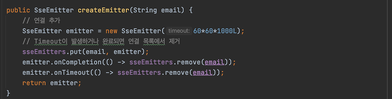 - onCompletion()과 onTimeout()은 연결이 완료되거나 타임아웃이 발생했을 때 해당 유저의 SseEmitter 객체를 제거한다.