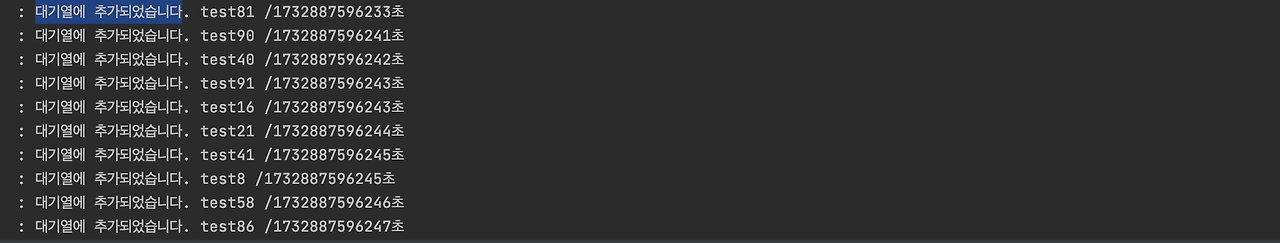 Kafka 메시지 대기열 시스템을 멀티스레드 환경에서 검증하는 테스트로, 여러 사용자가 동시에 대기열에 메시지를 생성해도 Kafka 프로듀서가 정상적으로 작동하는지 확인한다.