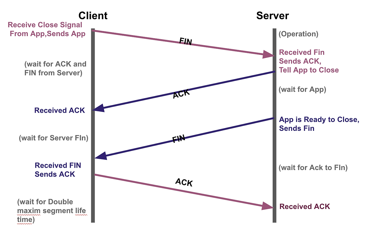 - TIME_WAIT : 의도치 않은 에러로 인해 데드락으로 빠지는 것을 방지, 클라이언트는 마지막 ACK를 보낸 후, 일정 시간 동안 연결을 유지하며, 지연된 패킷이 도착할 가능성을 대비