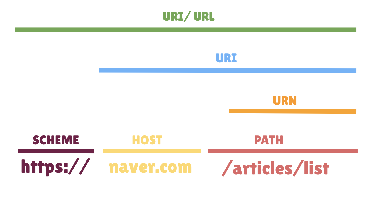 - URN (Name) : 리소스의 이름, 위치와 무관하게 리소스를 유일하게 식별
