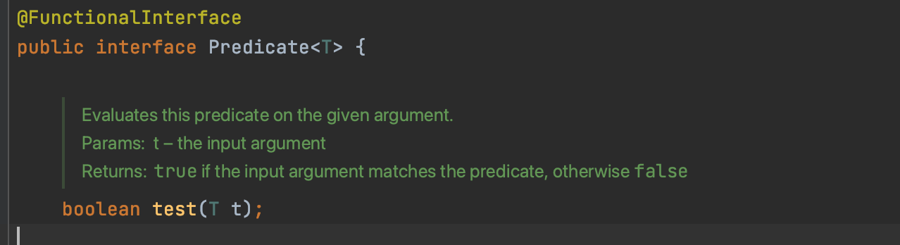 T타입의 매개변수를 입력 받아, 조건 검사 후 boolean 값을 반환한다.