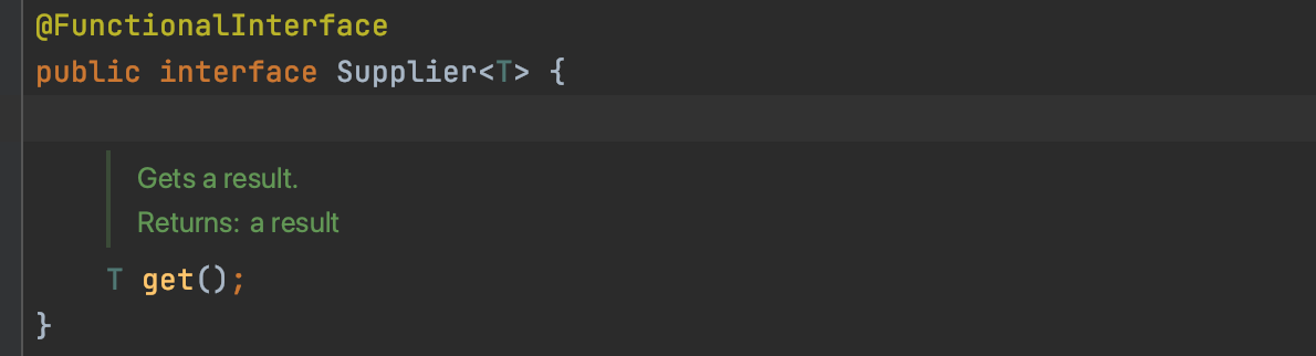 매개변수 없이 T타입의 값을 반환하는 함수형 인터페이스로 객체를 생성하거나 값을 제공한다.