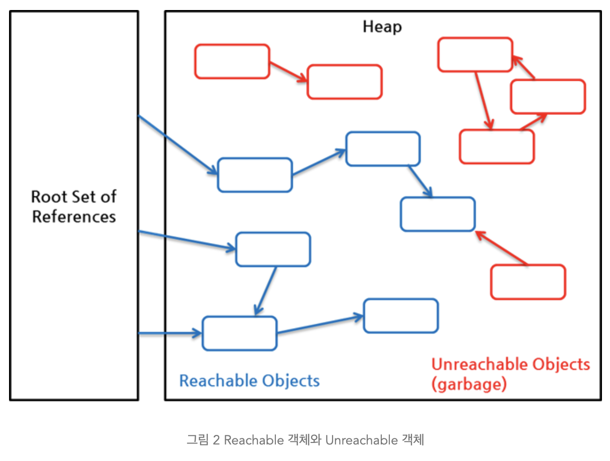 - 이 root set과 무관한 객체들이 unreachable 객체로 GC 대상이다.