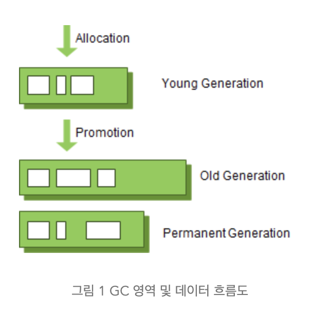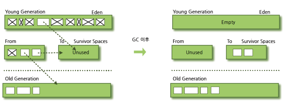 이 영역에서는 데이터가 가득 차면 GC를 실행한다. GC 방식에 따라 처리 절차가 달라진다.