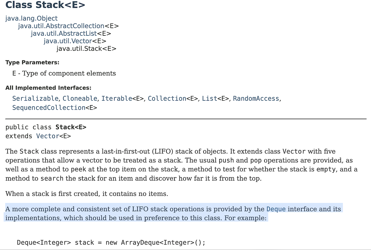 위의 문서에서 보듯이 자바에서는 Stack 대신 Deque 인터페이스를 사용할 것을 권장한다. Deque(Double-Ended Queue) 인터페이스는 양방향 큐로 스택(LIFO)과 큐의 기능(FIFO)을 모두 지원하며, 구현제로 ArrayDeque나 LinkedList가 있다.