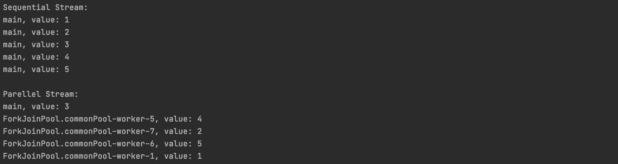 순차 스트림에서는 따로 스레드 풀을 사용하지 않고, main 스레드가 모든 데이터를 순차적으로 처리하고 있는 것을 볼 수 있습니다.