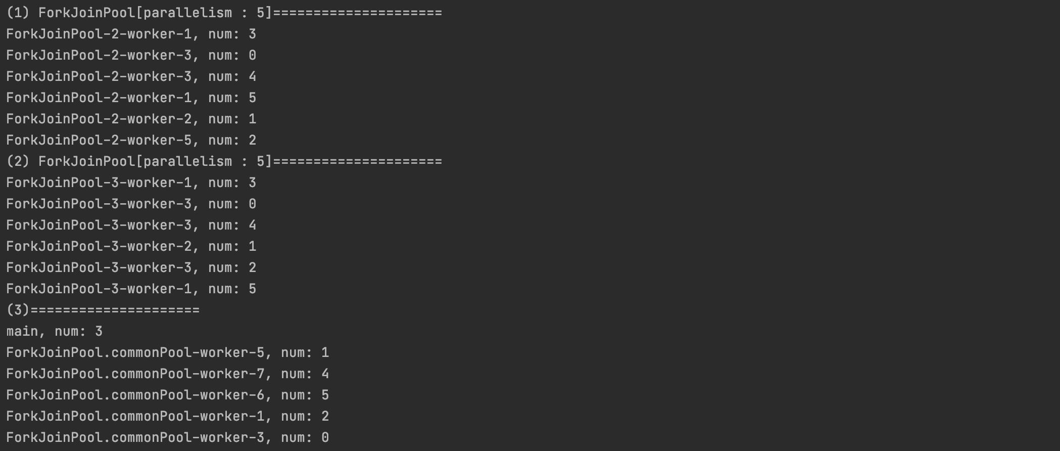 System.out.println("(2) ForkJoinPool[parallelism : 5]=====================");