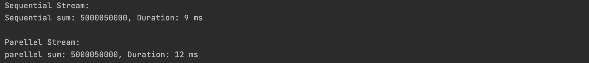 System.out.println("Sequential sum: " + sequentialSum + ", Duration: " + (end - start) + " ms\n");