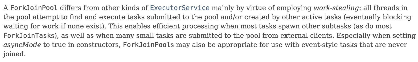 "A ForkJoinPool differs from other kinds of ExecutorService mainly by virtue of employing work-stealing:"