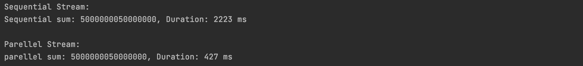 System.out.println("parellel sum: " + parellelSum + ", Duration: " + (end - start) + " ms");