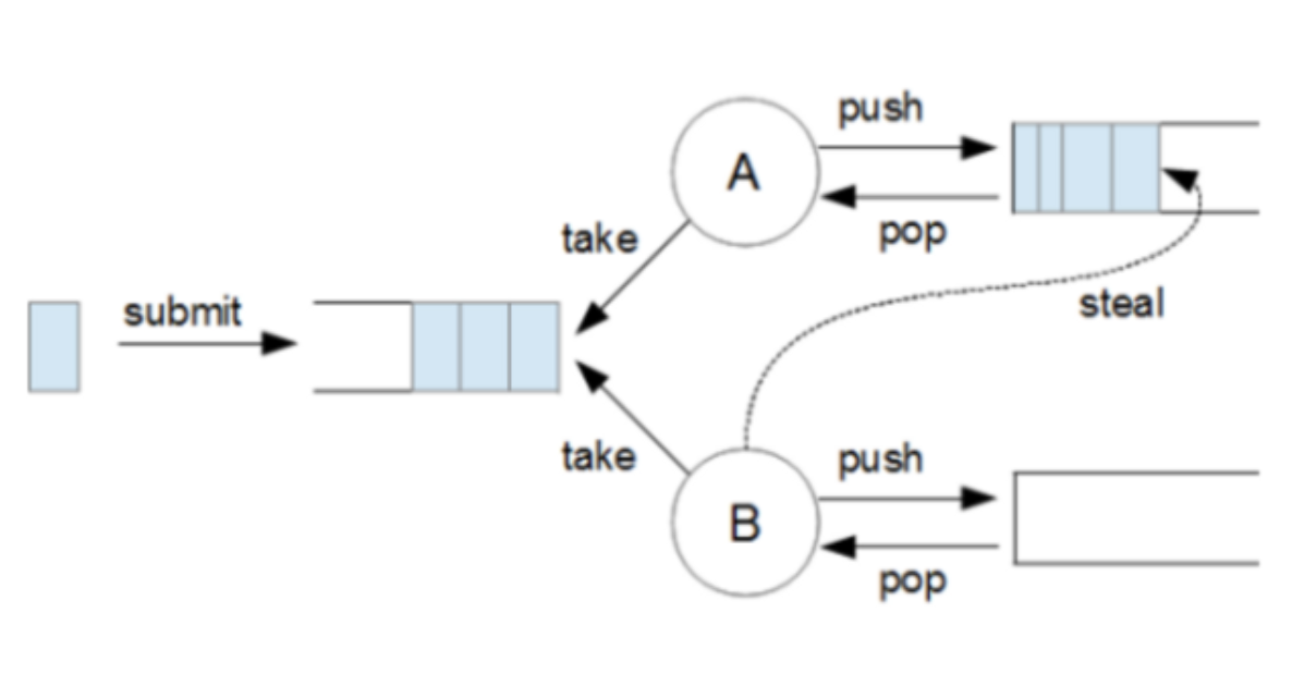 일부 스레드가 idle 상태로 남는 것을 방지하여 모든 스레드를 최대한 효율적으로 사용할 수 있도록 합니다. 큰 작업을 작은 하위 작업을 쪼갠 후 각 스레드에 할당하고 유휴 스레드가 남은 작업을 가져가 처리합니다.